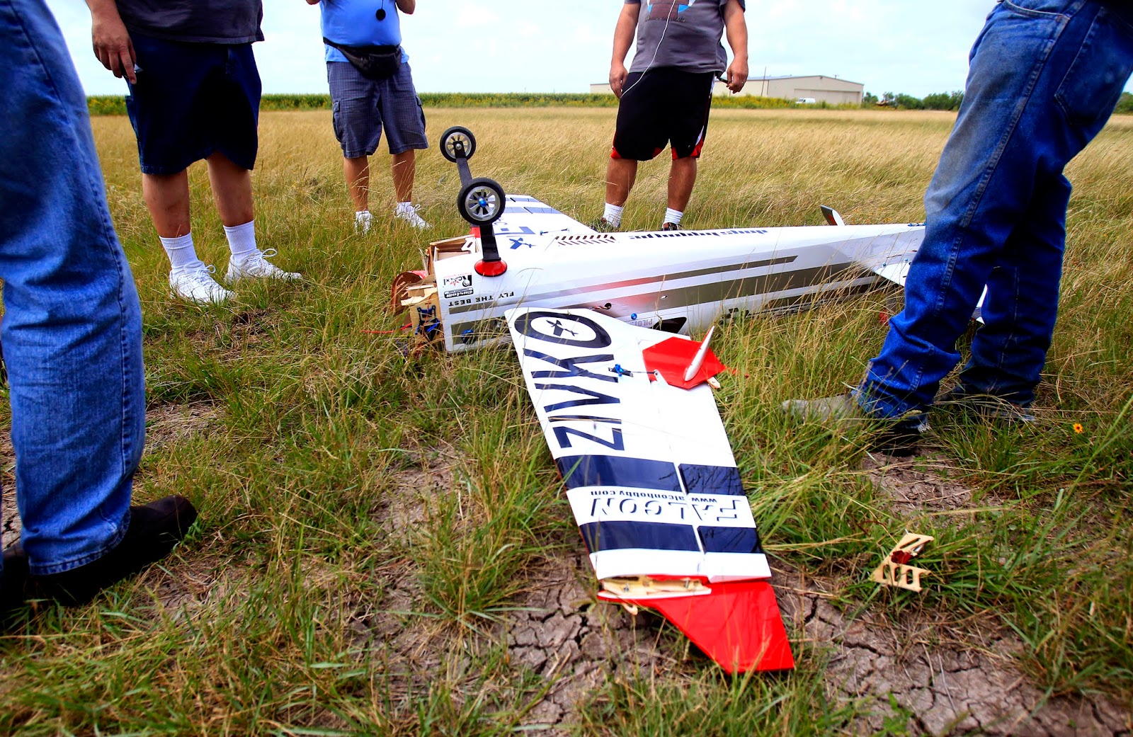 Members of the Rio Grande R/C Flyers surround a radio-controlled plane after it crashed to the ground Monday May 26, 2014 at Rebel Field in Mercedes. In case of accidents, team members determine the damage and either repair the plane or remove the electronics and engine and use the parts on other airframe.